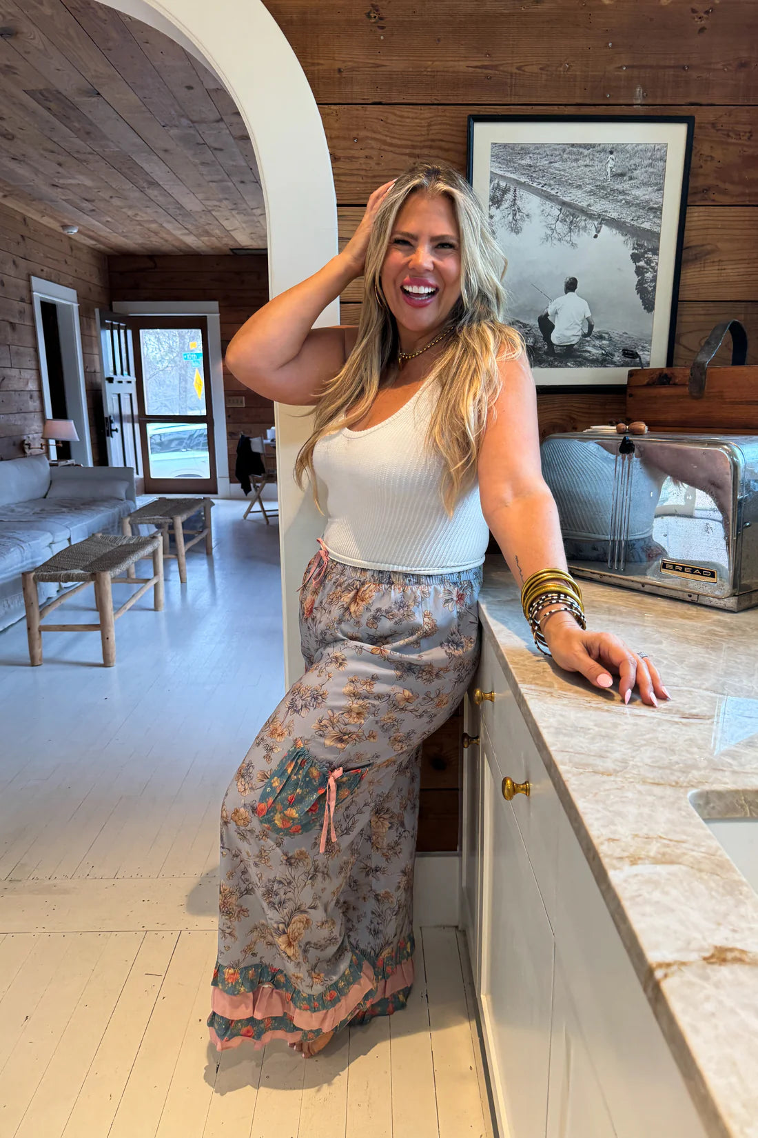 Flowy bloomer pants featuring a soft floral print with a relaxed, easy fit. Designed with a comfortable elastic waistband and adjustable drawstring, plus tiered ruffle hems for a touch of romantic charm. Lightweight and breezy—perfect for lounging, brunching, or styling up with your favorite tanks and knits.