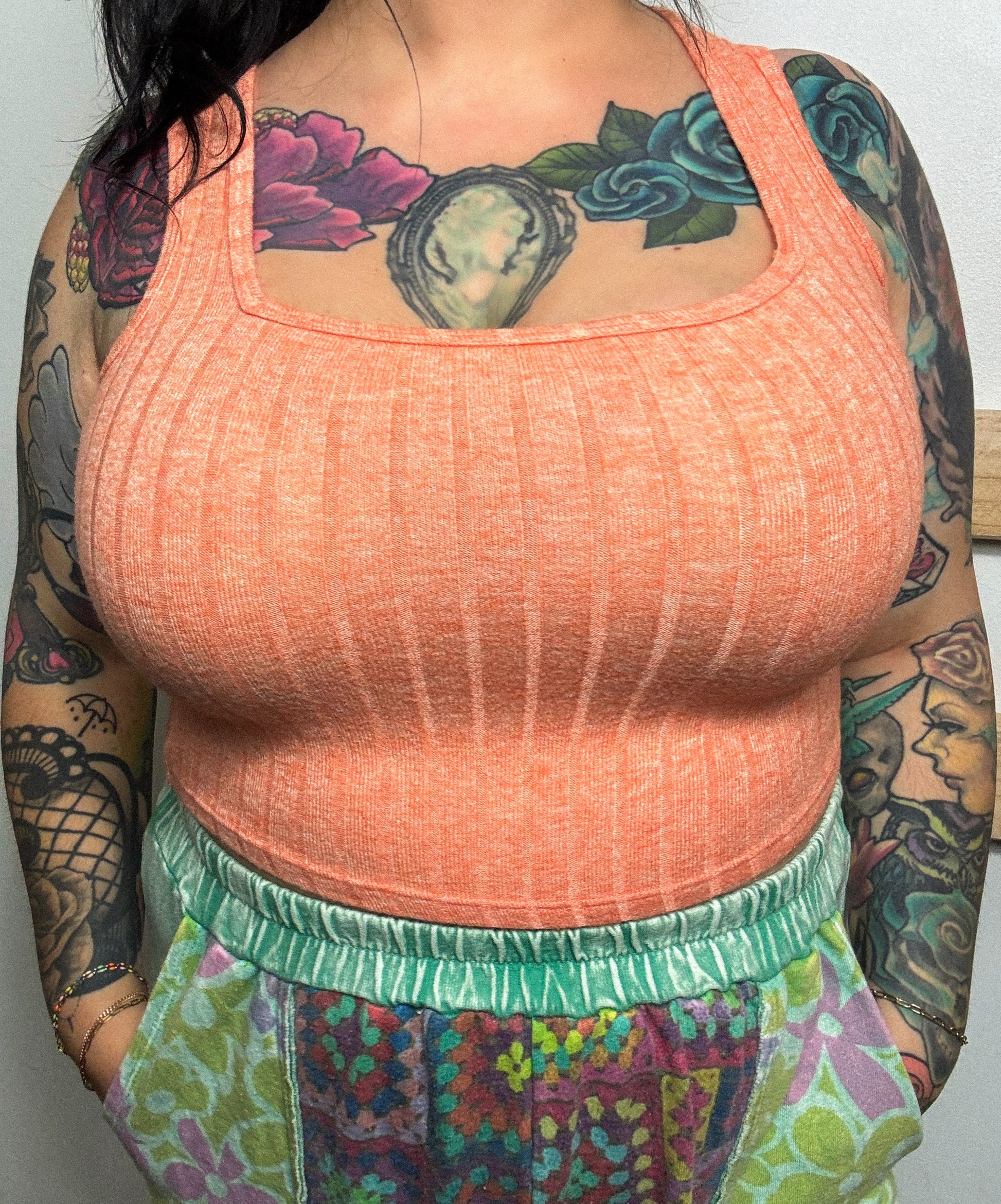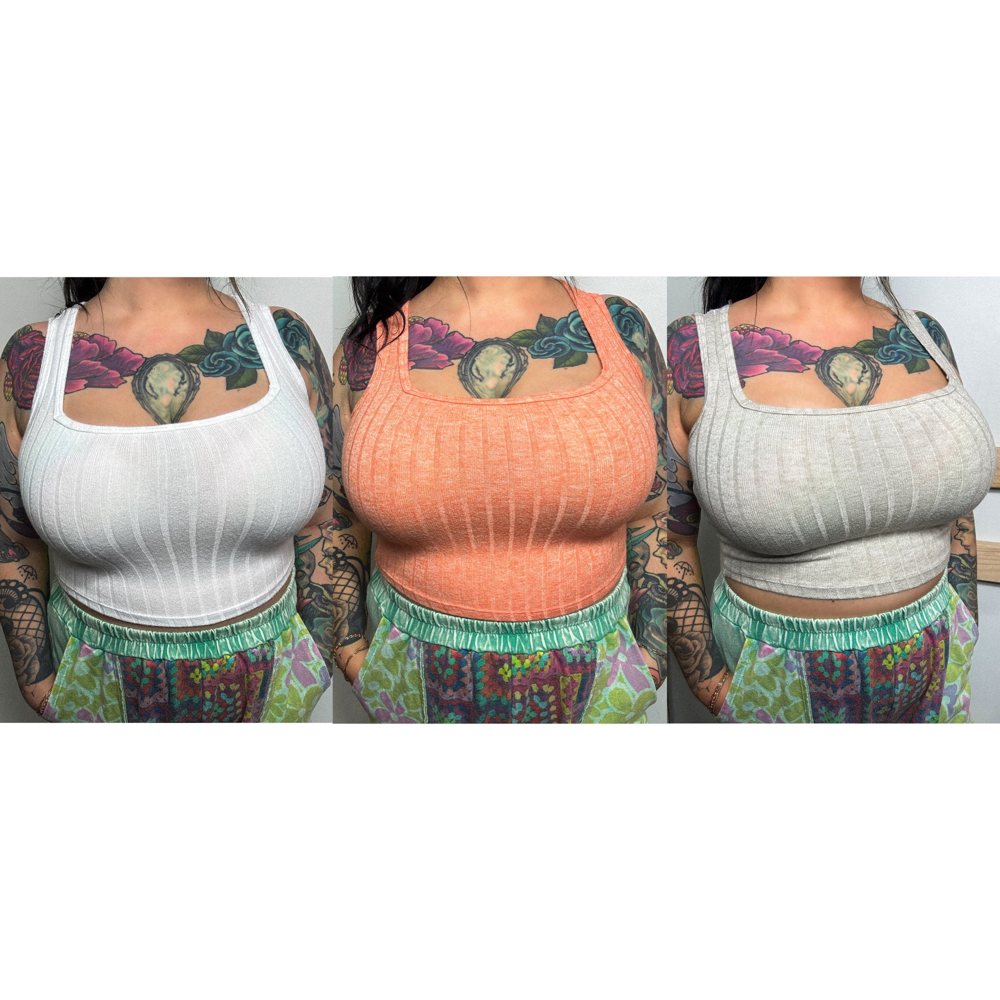 These cropped tanks are SO soft + comfy made with a rayon/poly/nylon blend šš¼ The square neck & thicker straps make these perfect to layer with a bra hiding the straps! Ā Iām wearing the large for reference (XL Top 38DD 18Wks preg)