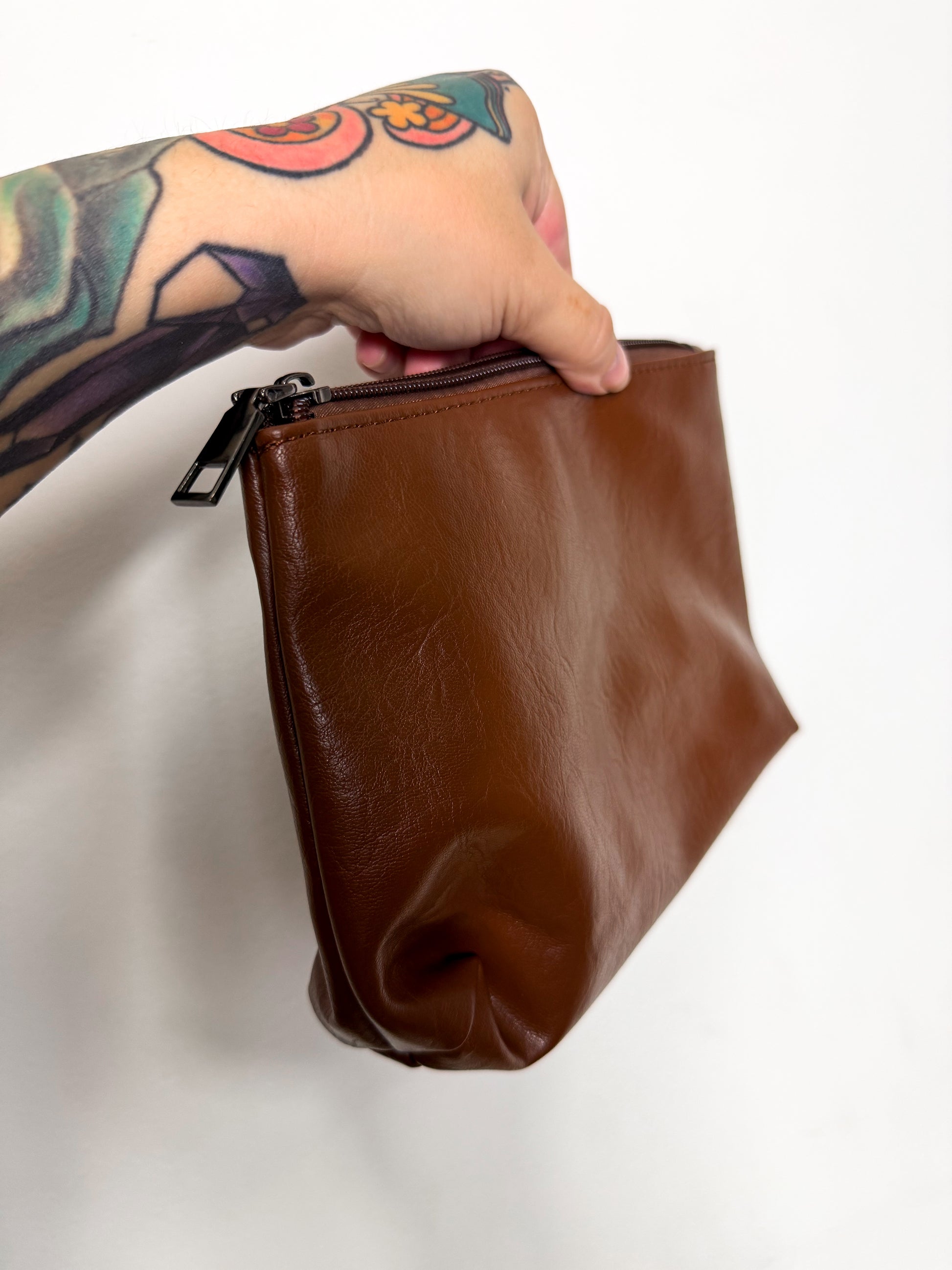 Microsuede roomy tote with a magnetic closure. Adjustable bucket straps, made with faux vegan leather. Comes with a small bag inside.