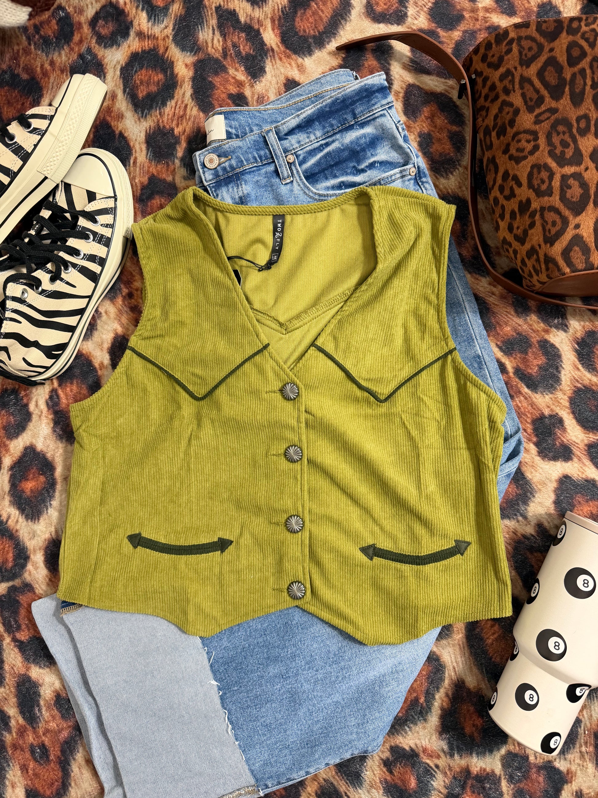 Original hand drawn design + unique green color this vest is a must have staple!